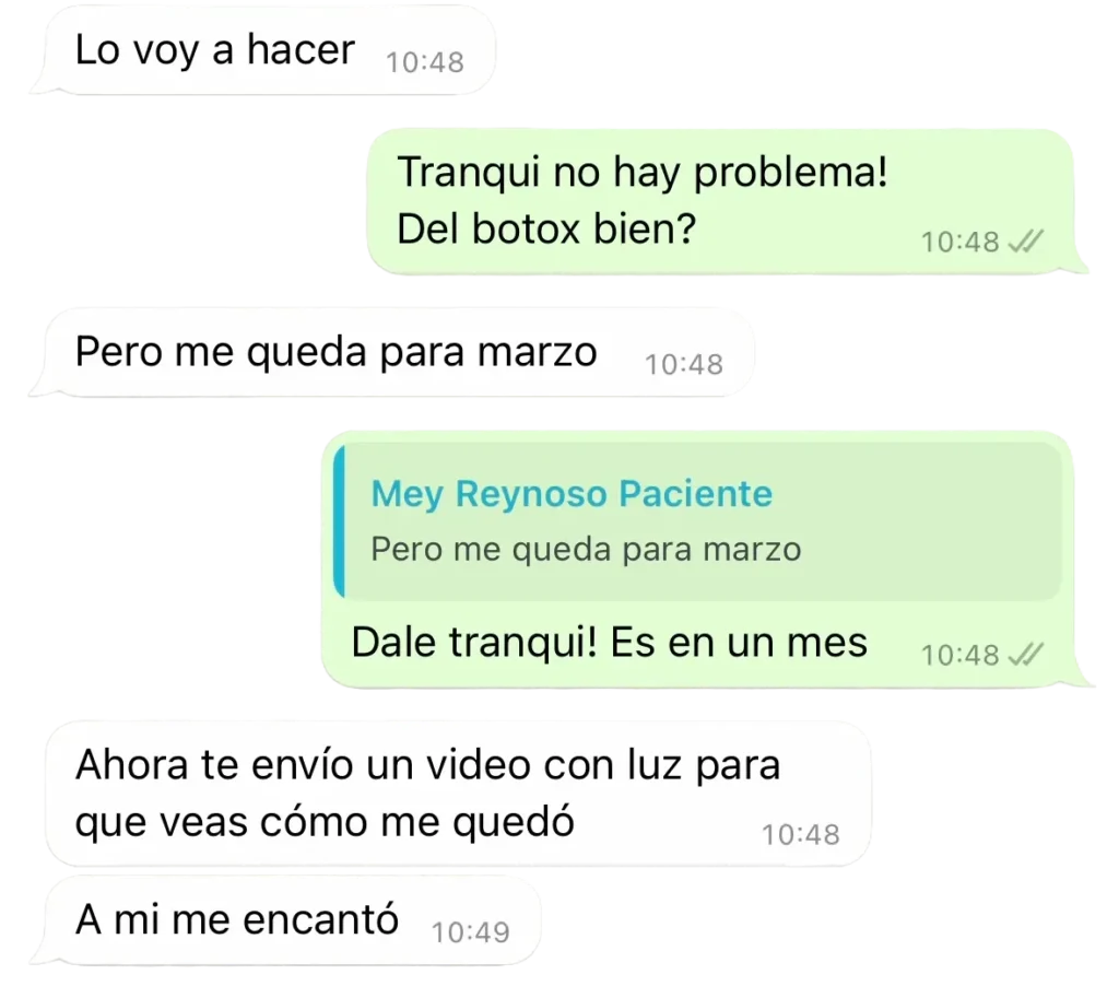 Me encantó atenderme con la doctora Daiana Linares. Ya había consultado a otros especialistas por botox, y ya me lo había hecho antes pero no en Argentina. Desde el momento que entré a su consultorio fue muy receptiva a todas mis preguntas y muy empática con el temor normal que todas tenemos al probar un lugar nuevo, sobretodo con el tema estético. La verdad que terminé muy tranquila y contenta ya que sé que elegí bien, la súper recomiendo!
